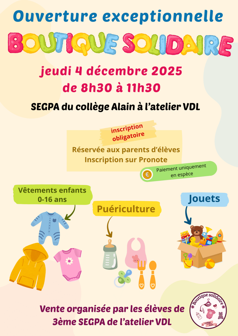 Après le succès de sa première édition, la Boutique Solidaire de l’atelier Vente-Distribution-Logistique (VDL) des élèves de 3ᵉ SEGPA rouvre exceptionnellement ses portes le jeudi 4 décembre 2025, de 8h30 à 11h30, au sein du collège Alain à Saint-Fons.