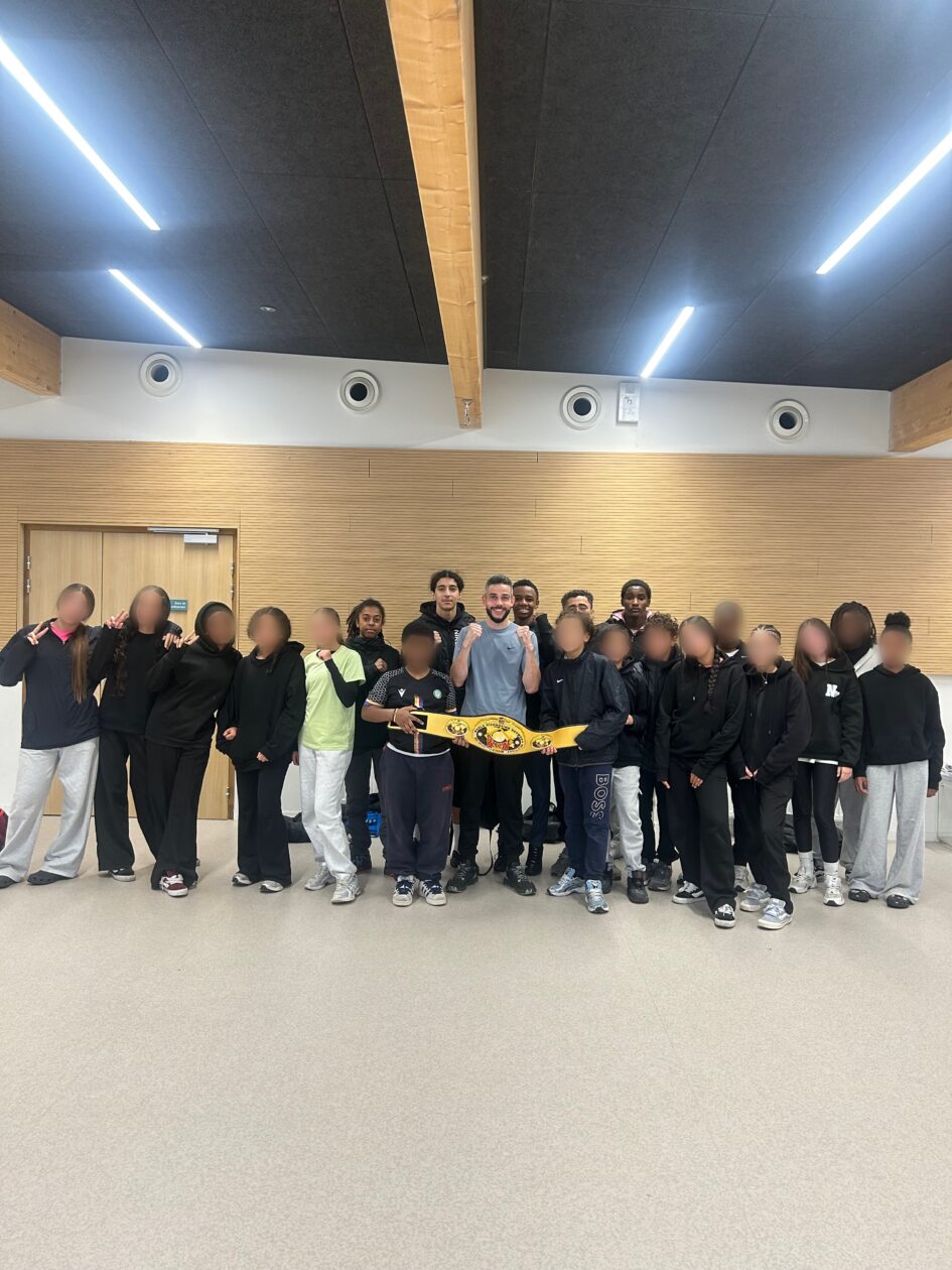 À la fin du cours, nous avons pu boxer avec lui et échanger pendant 30 minutes sur son parcours, son quotidien d’athlète professionnel, ses valeurs et l’importance de la persévérance dans la vie de tous les jours (et la vie scolaire).