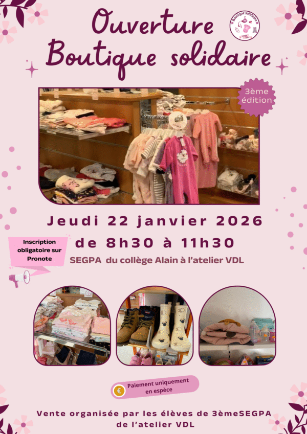 Les élèves de 3ème SEGPA de l’atelier Vente, Distribution et Logistique (VDL) ont le plaisir de vous annoncer l’ouverture exceptionnelle de leur boutique solidaire au sein du collège Alain ! Après plusieurs mois de collecte, ils invitent les parents d’élèves… Continue Reading →