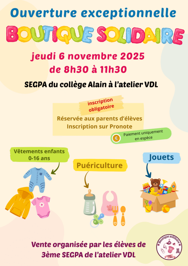 Les élèves de 3ème SEGPA de l’atelier Vente, Distribution et Logistique (VDL) ont le plaisir de vous annoncer l’ouverture exceptionnelle de leur boutique solidaire au sein du collège Alain ! Après plusieurs mois de collecte, ils invitent les parents d’élèves… Continue Reading →